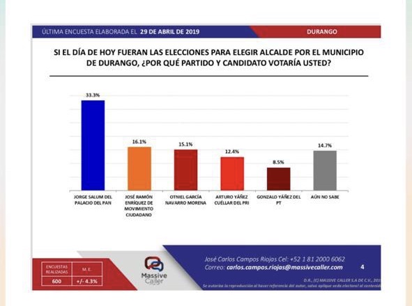 La encuestadora Massive Caller informó que en sus sondeos de opinión el candidato del PAN a la presidencia municipal de Durango, Jorge Salum se encuentra en primer lugar, por lo que rechazó imágenes circuladas en redes sociales en donde colocaron al panista en tercer lugar.