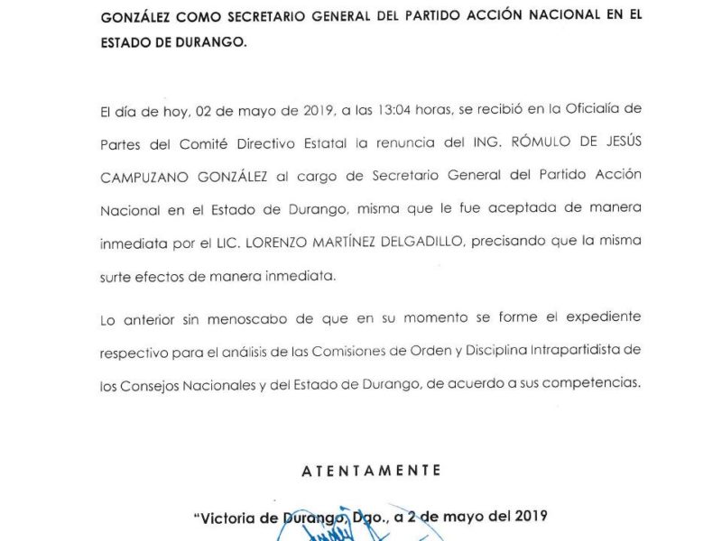 "El Comité Directivo Estatal del PAN acepta renuncia de Rómulo Campuzano"El panista Rómulo Campuzano González presentó su renuncia a la Secretaría General de dicho Instituto Político la tarde de este jueves. Fue a través de un documento sencillo, de unas cuantas líneas, donde señaló: “Ante la Comisión Permanente del Consejo Estatal del Partido Acción Nacional, presento formalmente mi renuncia al cargo de Secretario General del Comité Directivo Estatal”. La breve misiva está fechada en Durango, Dgo., a Jueves 2 de mayo de 2019 y firmada…