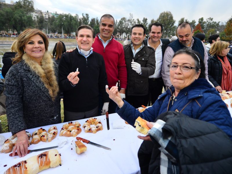 “Quien saque el tradicional monito, nos invita los tamales y buñuelos el próximo 2 de febrero”, les dijo el mandatario a las familias que se dieron cita en el Parque Guadiana para convivir y degustar, la rosca gigante que cada año adorna el majestuoso Lago de los Patos.