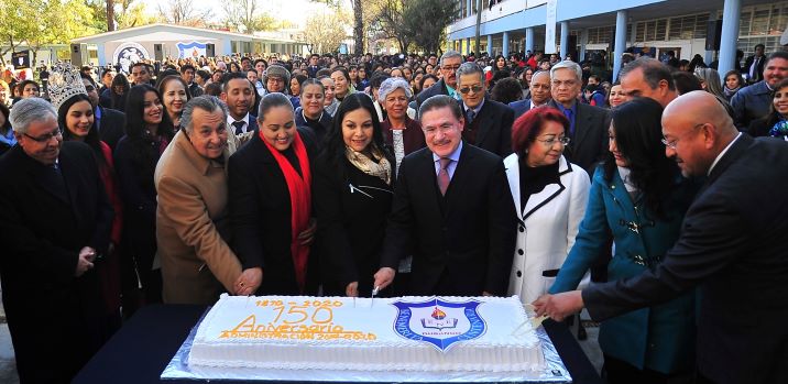 Junto a las autoridades educativas, Aispuro Torres, develó la placa conmemorativa que enmarca la historia de lo que comenzó como el Instituto de Niñas en 1870 y en compañía de directivos, alumnos y docentes, partió el tradicional pastel.