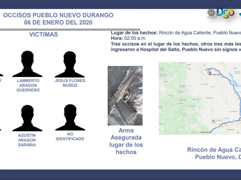 Los occisos son: Javier Lugo Mancinas, Lamberto Aragón Guerrero, Jesús Flores Muñoz, Paulino Cabrera Guerrero, Agustin Aragon Sarabia y una persona no identificada.