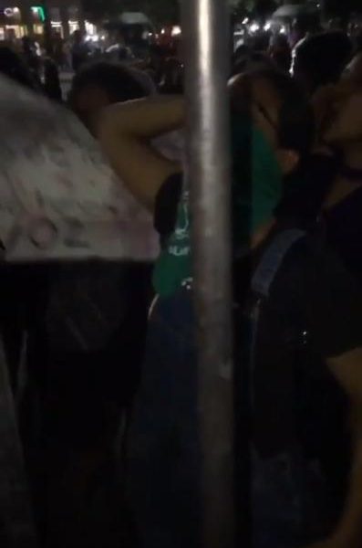 Las manifestantes fueron repelidas por algunas mujeres que portaban paliacate azul y en sus manos tenían rosarios, y se encontraban atrás del barandal, mientras las feministas con paliacate verde pro abortó, lanzaban consignas y por momentos tiraron bruscamente de la reja.