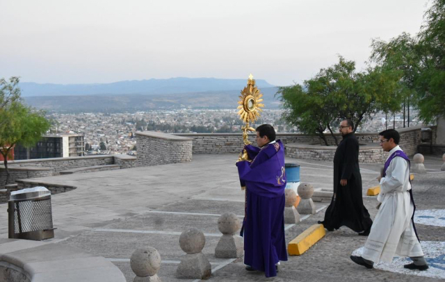 Debido a que se han suspendido las misas presenciales como medias preventivas por el Coronavirus, el arzobispo ha realizado ya una bendición a los duranguenses desde el mirador del Cerro del Calvario de esta ciudad, en donde con el Santisimo hizo oración por la salud de todos.