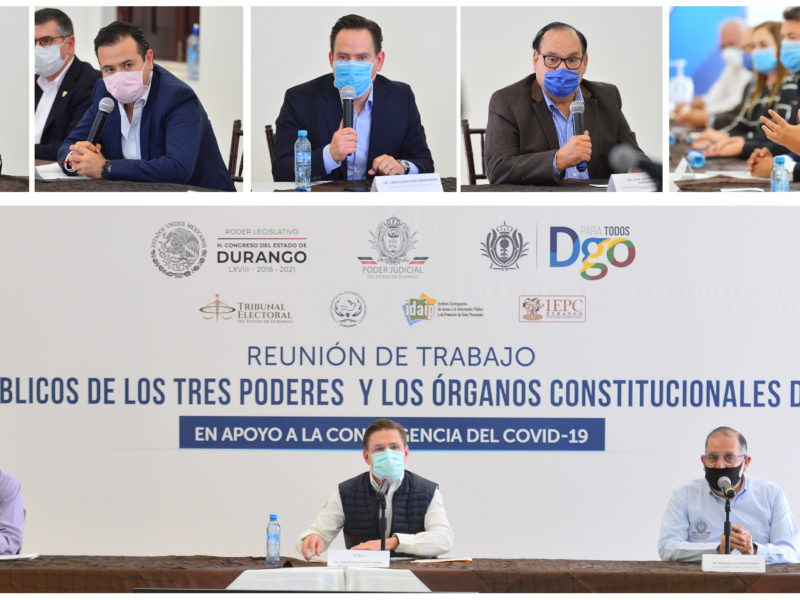 Los representantes de los tres Poderes en el estado, así como organismos constitucionales y empresarios, se sumaron a la iniciativa del gobernador José Rosas Aispuro Torres, de donar el 50 por ciento de su salario durante la contingencia sanitaria, quienes además, acordaron seguir buscando estrategias para mitigar los problemas que actualmente enfrentan las familias a causa de la pandemia.