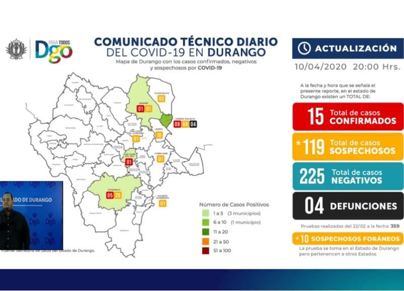 Autoridades sanitarias de Durango reportaron 15 casos positivos de Covid-19 en la entidad, de los cuales cuatro han fallecido, además de señalar la existencia de 119 casos sospechosos.
