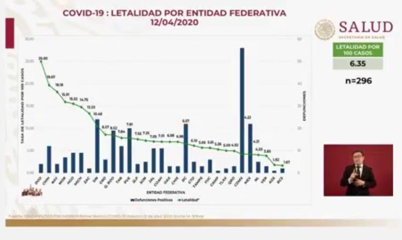 Así mismo la tasa de mortalidad se encuentra en el 0.23 por ciento cuando a nivel nacional es de 0.23 por ciento, toda vez que hasta este domingo 12 de abril se contabilizaron 4 Mil 671 casos positivos de Covid-19, de los cuales 296 han fallecido, ello en toda la República Mexicana.