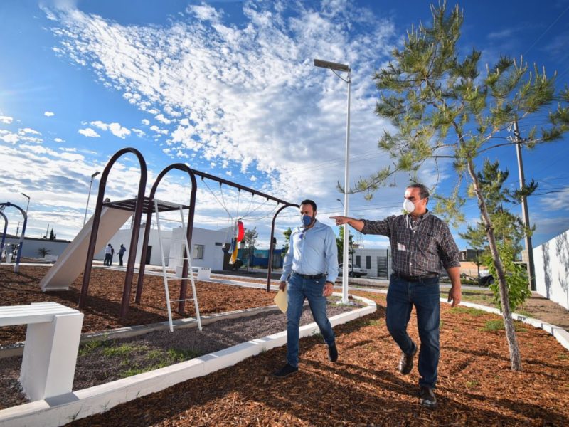 Posteriormente revisó el equipamiento con bancas, botes de basura, canchas de usos múltiples, alumbrado, juegos infantiles y andadores en el área del Villas del Guadiana VI.