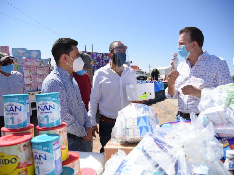 El presidente de la Junta de Gobierno y Coordinación Política, Esteban Villegas Villarreal y el diputado Gerardo Villarreal Solís, entregaron en la comunidad de Ignacio Allende, suplementos alimenticios, leche en polvo y pañales para adultos y niños, medicamentos para enfermedades crónicas y del cuadro básico, así como mil garrafones de agua purificada.