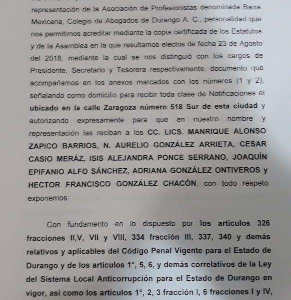 La presidencia del Poder Judicial del Estado no ha sido notificada por la Fiscalía Anticorrupción de alguna denuncia, por lo que presentarse el proceso se atenderá conforme a derecho, informó el Tribunal Superior de Justicia. Durangos21 solicitó a la Dirección de Comunicación Social del Poder Judicial del Estado su posicionamiento ante la denuncia que el Colegio de Abogados presentó ante la Fiscalía Anticorrupción, y en ese sentido esa instancia precisó lo anterior. “Hasta el momento…
