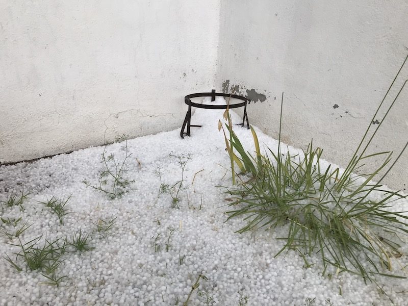 El granizo se reportó sobre todo por la zona de avenida Lasalle a la altura del fraccionamiento Paseo del Saltito y en menor medida sobre el Fraccionamiento Las Alamedas II, pues para el área del Fraccionamiento Villa de Tapias básicamente se registró lluvia que se prolongó por unos 10 minutos aproximadamente.