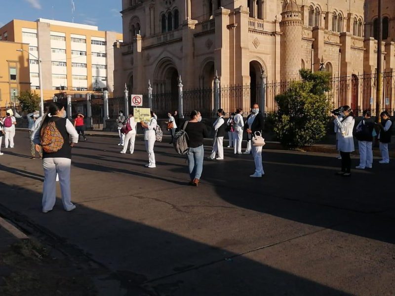 El principal objetivo de su protesta es obtener su base como trabajadores del hospital, pero también refieren, a través de las pancartas, que el recurso recibido como pago quincenal es muy bajo, además de que carecen de prestaciones, lo que es preocupante en medio de una situación sanitaria como la que se vive ahora.