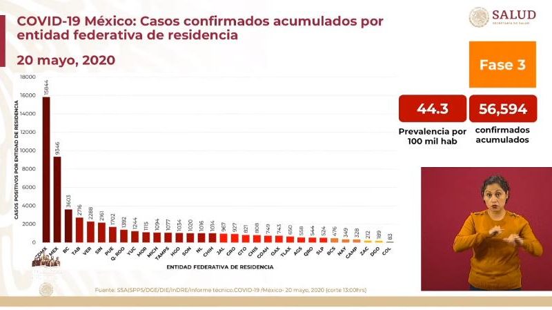 A nivel nacional, suman 56 mil 594 casos acumulados de Covid-19, esto es 2 mil 248 nuevos casos con respecto al martes, cuando se reportaron 54 mil 346 casos de Covid-19.