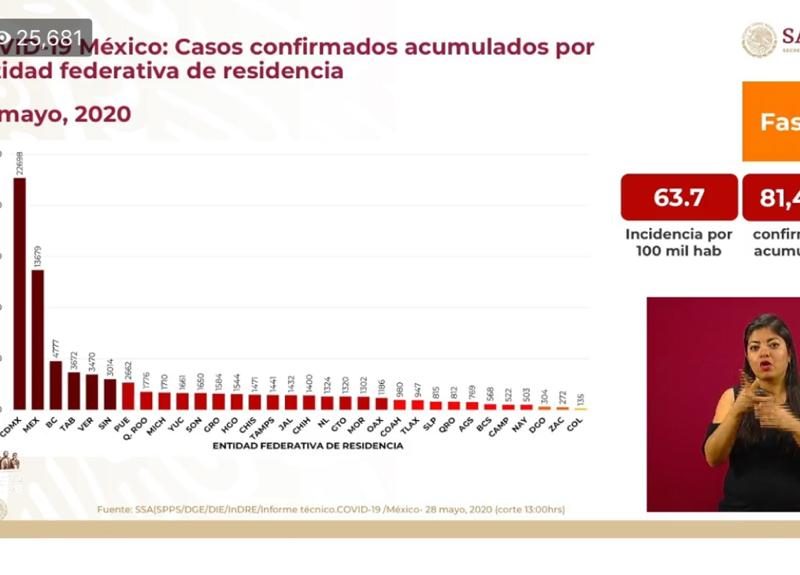 Además, en el ámbito nacional se reporta que suman 81 mil 400 casos acumulados de Covid-19, lo que significa que existen 3 mil 377 nuevos casos, en tanto que los decesos suman 9 mil 044 casos, esto es 447 decesos más con respecto al miércoles.
