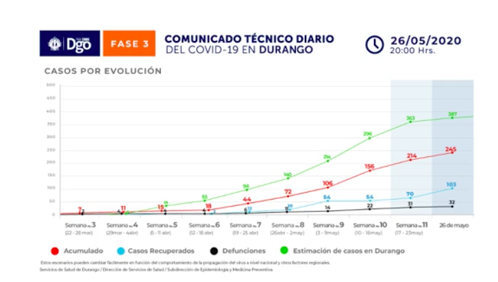 "Confirma Fiscalía que uno de sus Elementos Sale Positivo al Covid-19"Este martes se reportaron tres defunciones más por Covid-19 en el estado de Durango, con lo cual suman 35 fallecimientos y 245 casos positivos, informó el Secretario de Salud del Estado, Sergio González Romero. Precisó que la defunción 33 es de una persona del sexo masculino de 72 años del municipio de Gómez Palacio, quien inició con los síntomas el 17 de mayo, el 21 del mismo mes salió la prueba positivo y falleció este…