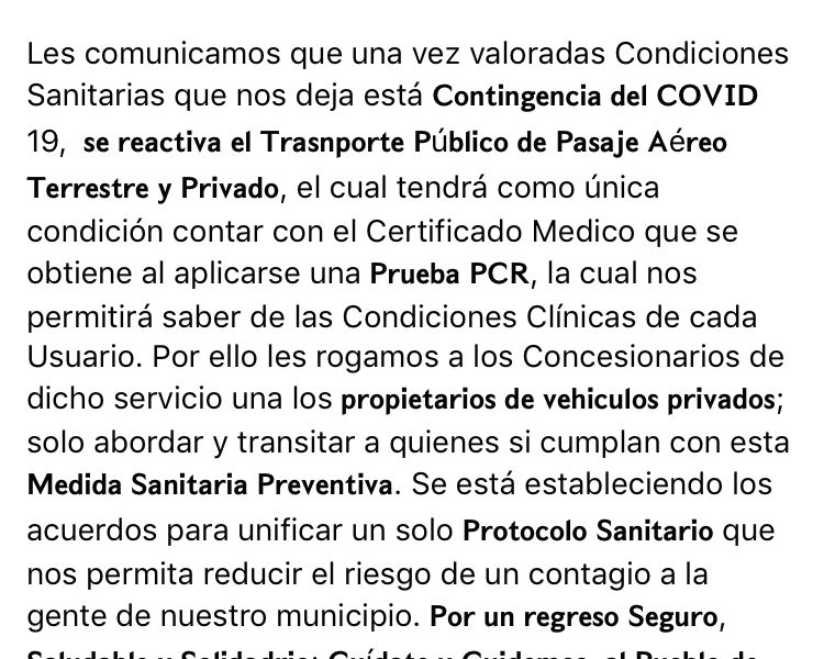 En la circular se advierte que ha sido reactivado el transporte publico de pasajeros aéreos terrestre y privado por lo que se tiene como única condición presentar el certificado médico que incluya la prueba PCR.