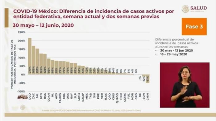Durango volvió a encabezar la tasa de incidencia con un crecimiento del 216 por ciento, en tanto se reportan 81 nuevos casos de Covid-19 con lo cual se acumulan 856 casos, según las gráficas expuestas por José Luis Alomía, Director de Epidemiología del Gobierno Federal.