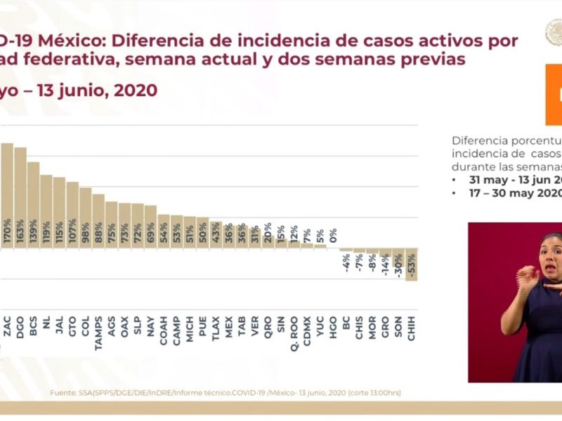 En las mismas imágenes se observó que Durango desciende a un segundo lugar en la tasa de incidencia de Covid-19 activo con un 163 por ciento, superado por Zacatecas que alcanzó un 170 por ciento con respecto a las últimas dos semanas.