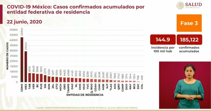 A nivel nacional los casos acumulados suman 185 mil 122 personas, esto es, se confirmaron en las últimas horas 4 mil 577 nuevos casos de Covid-19, en tanto que los decesos notificados en las últimas horas fueron 759 fallecidos, con lo cual la cifra de defunciones asciende a los 22 mil 584 personas sin vida.
