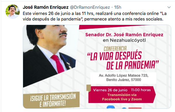 La conferencia trascendió a través de sus redes sociales en donde inserto una liga para poder escuchar su disertación que ocurrió alrededor de las 11:00 horas.