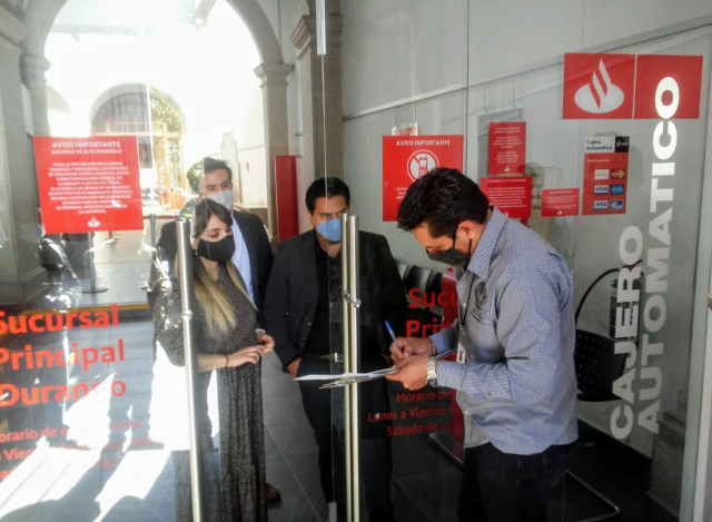 "Clausuran Sucursal Bancaria Santander por no Cumplir con las Medidas de Sanidad"Por: Harimm García. El Director Municipal de Protección Civil, Gustavo Paredes Moreno, indicó que como parte de la nueva normalidad, su dependencia junto a otras instancias municipales mantienen en revisión cada uno de los comercios para asegurarse que cumplan con los lineamientos establecidos por el Sector Salud. En este sentido, indicó que al día de hoy han revisado aproximadamente 500 establecimientos en conjunto con los comerciantes y empresarios que tienen autorizado reabrir sus locales, que…