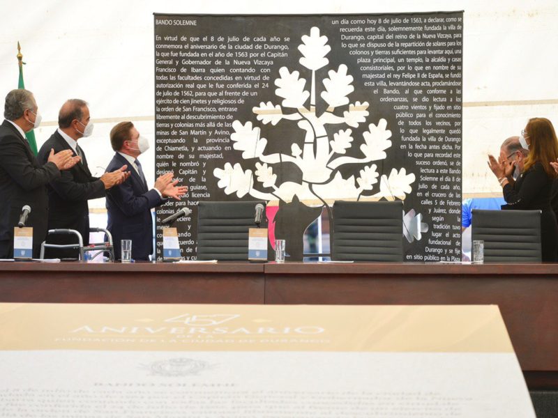 En la reunión de cabildo, el presidente municipal Jorge Salum del Palacio, así como el Gobernador José Aispuro y el presidente del Poder Judicial, Calderon, así como el presidente de la Junta de Gobierno del Congreso del Estado, Esteban Villegas Villarreal develaron el bando solemne para conmemorar la fundación de la ciudad.