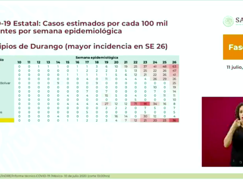 Hasta la semana 26 se estima un crecimiento del 55 por ciento en la incidencia de Covid-19 en Durango, expresó Hugo López Gatell, Subsecretario de Salud del Gobierno Federal, quien señaló a Gómez Palacio como el municipio con mayor incidencia en la entidad.