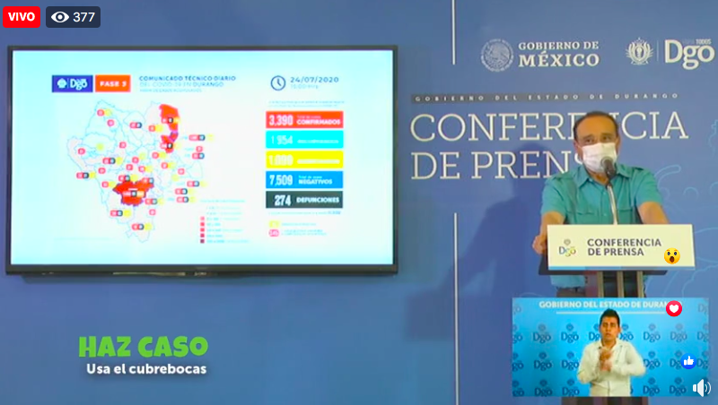 El Secretario de Salud, Sergio González Romero, informó que en total suman 3 mil 390 casos de Covid en el estado y 274 defunciones.