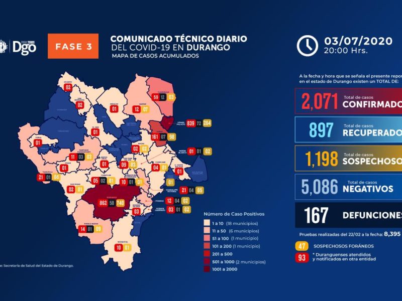 "Aliviar Deuda de Países Pobres, por Pandemia"Durante las últimas 24 horas se detectaron 60 casos más de Covid-19, por lo que se acumulan 2 mil 71 casos, en tanto que se reportaron cinco nuevas defunciones para alcanzar un total de 167 personas fallecidas por el nuevo coronavirus. Sergio González Romero, Secretario de Salud desglosó que el deceso número 163 corresponde a una mujer de 44 años residente de Durango que fue atendida en el Hospital General 450, en tanto el deceso…