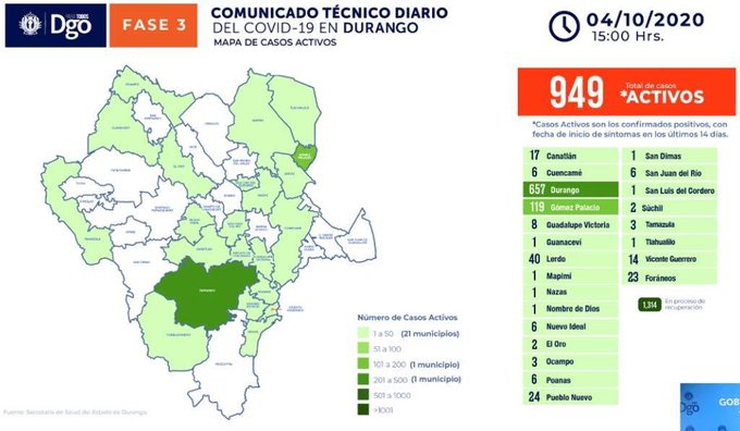 En el municipio de Lerdo los casos activos pasaron de 49 a 40 por lo que hubo una reducción de nueve casos, además en Pueblo Nuevo se pasó de 26 a 24 por lo que también una una disminución de dos pacientes, y finalmente en Canatlán se pasó de 18 a 17, una disminución de un paciente.