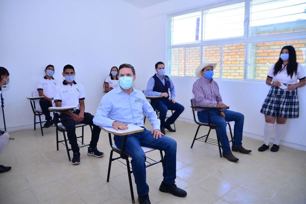 Pueblo Nuevo, Dgo.- Estudiantes y maestros contarán con espacios más amplios y adecuados cuando regresen a clases presenciales para fortalecer el proceso de enseñanza, afirmó el gobernador José Rosas Aispuro Torres, al entregar tres aulas en el plantel Educación Media Superior a Distancia (EMSaD) 36, del Colegio de Estudios Científicos y Tecnológicos del Estado (CECyTE) como parte de la nueva infraestructura escolar.