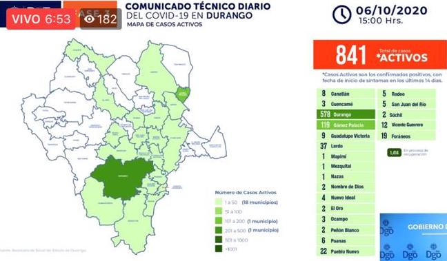 A la fecha el municipio de Durango acumula 4 mil 621 casos con 279 defunciones, mientras que Gómez Palacio suma 2 mil 787 contagiados de los cuales 267 han perecido, y el municipio de Lerdo reporta 751 casos de los cuales 41 han perecido.
