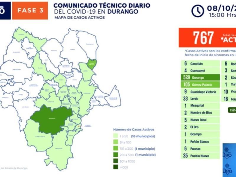 En las últimas 24 horas hubo una reducción de 37 casos activos pues de 794 que se reportaron el miércoles se pasó a los 767 este jueves, por lo que en el municipio de Durango hubo una disminución de 33 pacientes, ya que se pasó de 562 a 529 reportados este jueves.