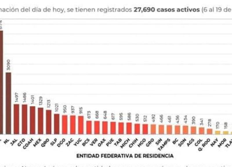 De acuerdo con las cifras federales, Durango contabiliza un total de 950 casos activos de Covid-19, aunque en el país se estima la existencia de 27 mil 690 personas en esas condiciones, y es la ciudad de México en donde se tiene la mayor cantidad de casos activos con 5 mil 174 personas, seguido por Nuevo León con 3 mil 90 y Jalisco con mil 497.