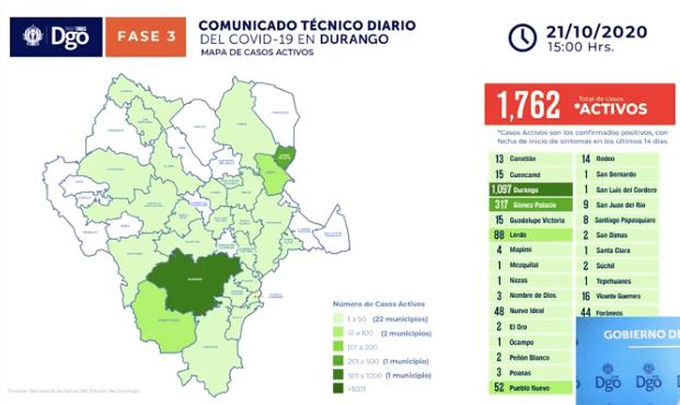 Además, en Lerdo de 63 se llego a los 88 casos activos, esto es 25 pacientes más, mientras que en Pueblo Nuevo de 44 se llego a los 52, un aumento de ocho pacientes y finalmente en Nuevo Ideal de 35 se llego a los 48, por lo que sumaron 13 nuevos casos.