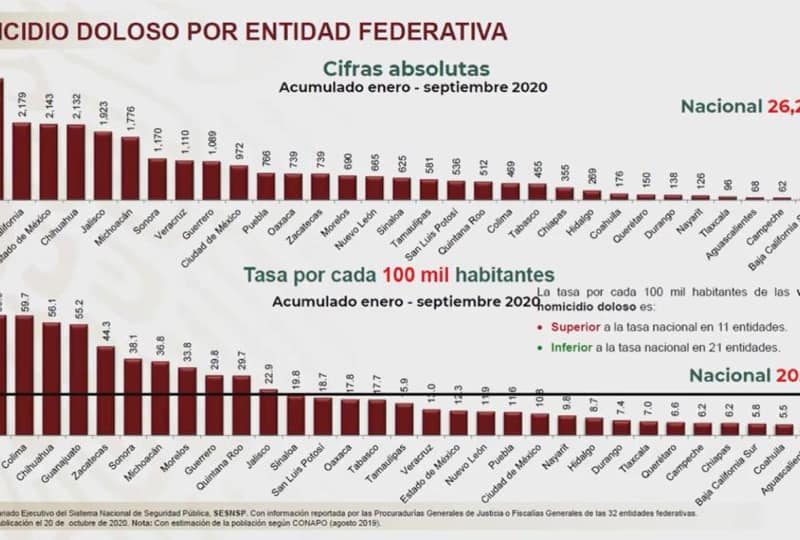 Aunque en la conferencia de prensa el Secretario de Seguridad y Protección Ciudadana refirió un crecimiento, así como un registro de 138 homicidios dolosos, la Incidencia Delictiva reportada por el Secretariado Ejecutivo del Sistema Nacional de Seguridad Pública muestra cifras diferentes, ya que de enero a septiembre del presente año contabiliza solo 115 denuncias.