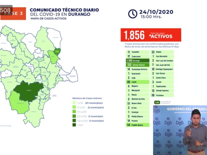 Cabe destacar que el viernes no se hizo alusión a los casos positivos, sin embargo en Gómez Palacio se reportaron 320 casos el jueves mientras que este sábado fueron 322 casos, en tanto que en el municipio de Lerdo disminuyó pues el jueves había 92 y este día 85 casos activos.
