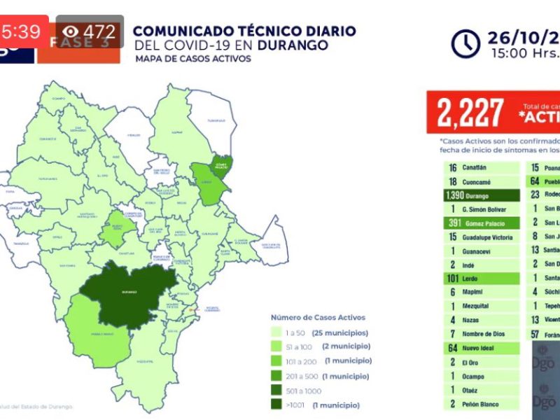 En el municipio de Durango se pasó de mil 212 a los mil 390, esto es 178 casos activos ás en solo 24 horas, mientras que en Gómez Palacio de 324 se llegó a los 391 casos activos esto es 67 pacientes más.