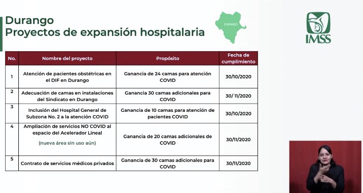 En conferencia de prensa que se transmitió a través de las redes sociales del IMSS, Borja precisó lo anterior desde la ciudad de México en donde mostró que hasta el 15 de octubre se habían reconvertido 161 camas para poder colocar ahí pacientes de Covid-19, sin embargo para este 30 de octubre se logró incrementar en 34 los espacios pues para ello se dispuso la atención de24 pacientes obstétricas en el DIF estatal y 10 más en el Hospital General de Zona Número dos.
