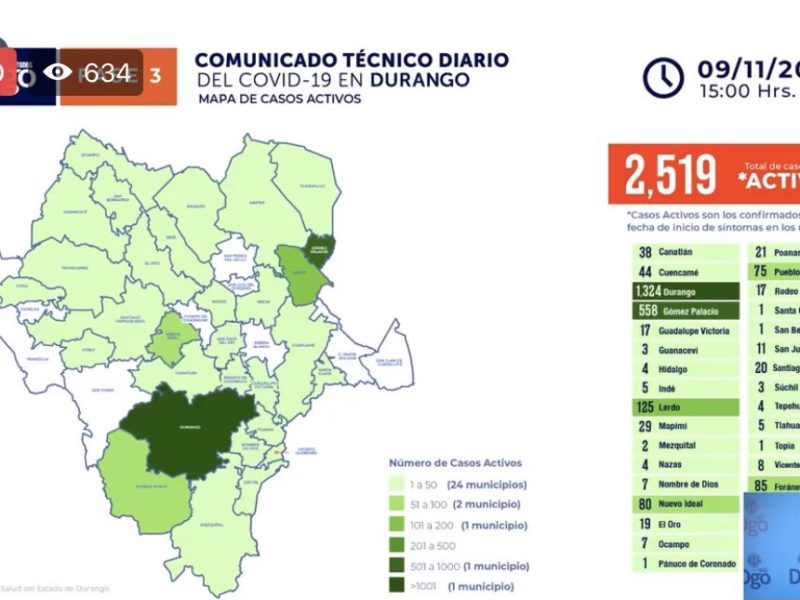 Durango reportó este lunes la existencia de 2 mil 519 casos activos de Covid-19, de los cuales mil 324 se encuentran en el municipio capitalino, en tanto en Gómez Palacio existen 558, en Lerdo 125, en Nuevo Ideal 80 casos y en Pueblo Nuevo 75 pacientes con el nuevo coronavirus con menos de 15 días de vigencia.