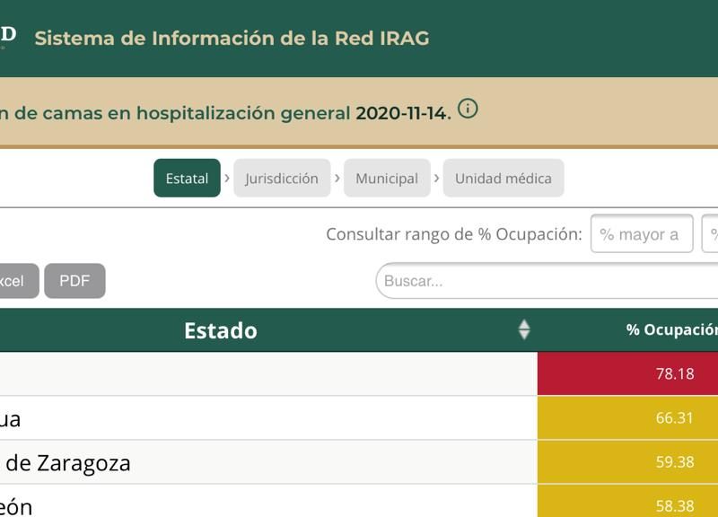 Así, en cuanto unidades médicas se reporta al corte del 14 de noviembre que el Hospital General de Zona Número 46 del IMSS en Gómez Palacio se encuentra al 100 por ciento, al igual que el Hospital Santiago Ramón y Cajal del ISSSTE en Durango, al igual que el Hospital General de Gómez Palacio y el Hospital 450 de Durango, así como el Hospital Militar de Zona Cinco de Mayo.