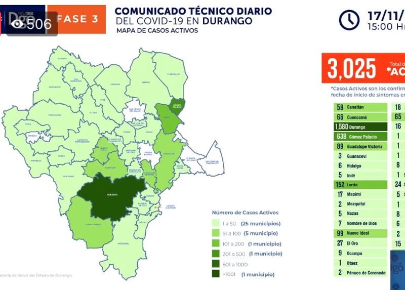 Tan sólo en el municipio de Durango se contabilizan mil 580 casos, en Gómez Palacio 638 casos activos, en Lerdo 152, en Nuevo Ideal 99, mientras que en Guadalupe Victoria existen 89 pacientes con el virus con menos de 15 días de haber sido confirmado.