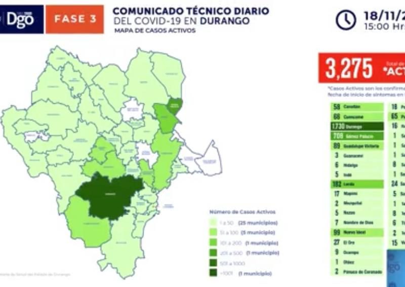 Este miércoles se reportaron un total de 3 mil 275 casos activos de Covid-19 en el estado de Durango, lo que implicó un aumento de 250 casos con respecto al martes cuando se reportaron 3 mil 25 pacientes con la enfermedad con menos de 15 días de vigencia.