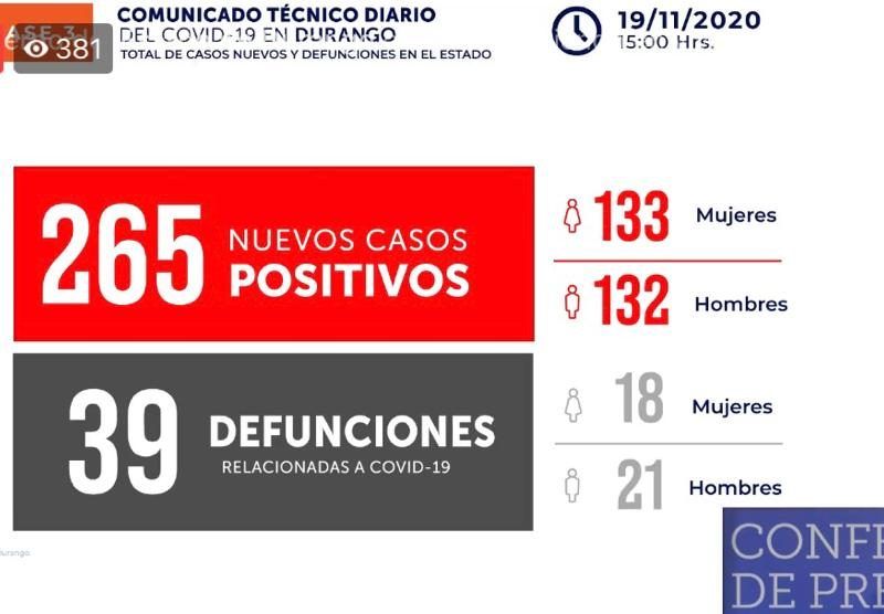 Del total de los 265 nuevos contagios, 144 tienen residencia en Durango, 43 en Gómez Palacio, 16 en Nuevo Ideal, 14 en Canatlán, 10 en Cuencamé y 10 en Lerdo, en tanto que en El Oro, se reportaron ocho casos, en Ocampo seis casos, en tanto Santiago Papasquiaro reportó cuatro casos, Guadalupe Victoria tres casos.