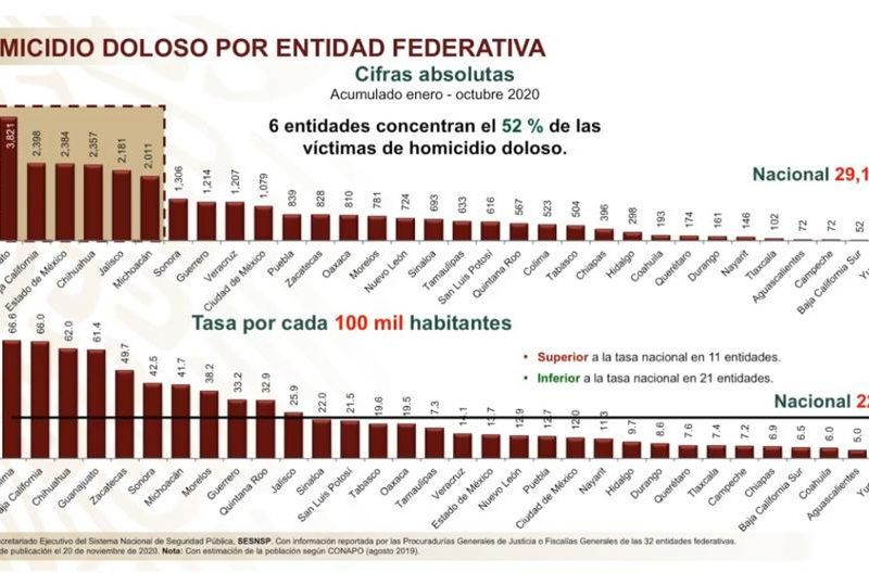 Pese al repunte en el número de homicidios dolosos, Durango es el séptimo estado del país con menor cantidad de este tipo de delitos, pues acumula 161, en tanto que Nayarit tiene 146, Tlaxcala 102, Aguascalientes y Campeche 72, Baja California Sur 52 y Yucatán 40.