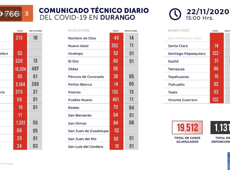 Por segunda ocasión en 48 horas las autoridades sanitarias de Durango no reportaron decesos por Covid-19, aunque confirmaron 285 nuevos casos confirmados para acumular un total de 19 mil 512 personas contagiadas.