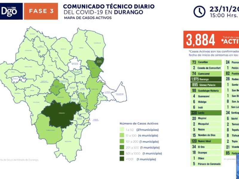 En el municipio de Lerdo se pasó de 192 a 220 casos, un aumento de 28 pacientes, mientras que en Nuevo Ideal se pasó de 117 a los 120, y en Guadalupe Victoria de 95 a 98 casos activos.