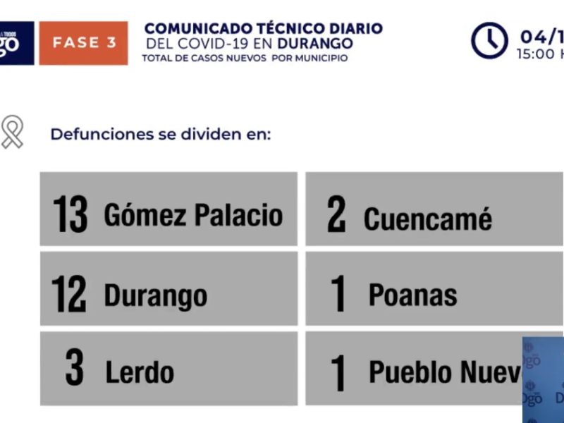 "Supera Durango 15 Mil Contagios de Covid-19; Reporta en 24 Horas 32 Defunciones por Nuevo Coronavirus."