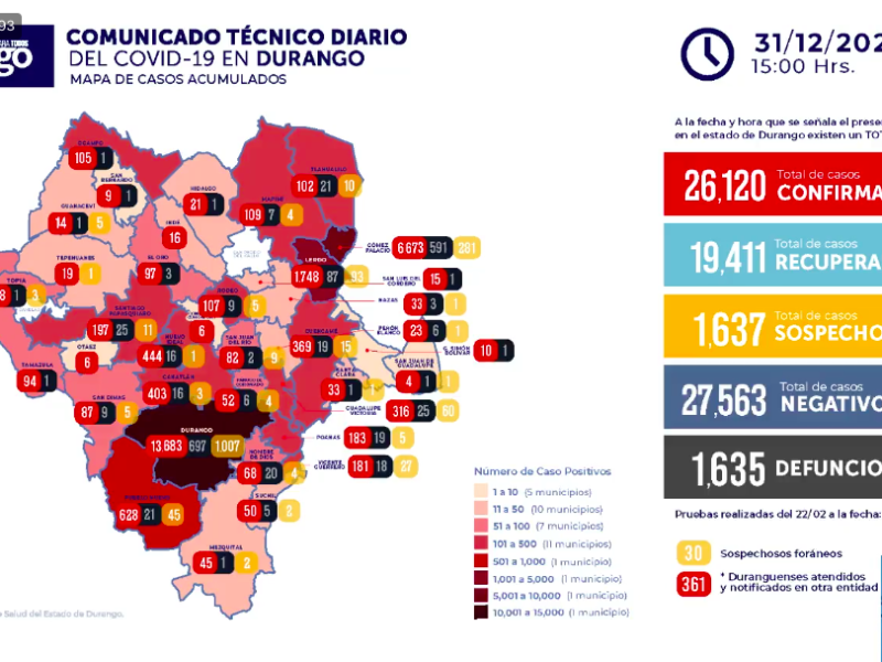 "La SCT Evalúa los Daños que Han Dejado las Nevadas en Durango"En el último día del 2020, se confirmaron 79 nuevos casos de Covid-19 para acumular 26 mil 120 personas contagiadas con el nuevo coronavirus, además de reportarse 14 decesos para sumar mil 635 defunciones. Cecilia Cano Rodríguez, representante de la Secretaría de Salud del Estado de Durango precisó que de los 14 decesos reportados este jueves, ocho corresponde a mujeres y seis a hombres, los cuales ocho tenían residencia en Durango, cuatro en Gómez Palacio,…