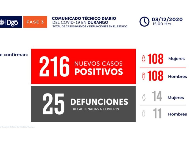 De los 216 nuevos casos confirmados este jueves, 108 son mujeres y 108 son hombres; 94 tienen residencia en Gómez Palacio, 71 en Durango, 16 en Lerdo, 13 en Nuevo Ideal, y cuatro en Guadalupe Victoria.