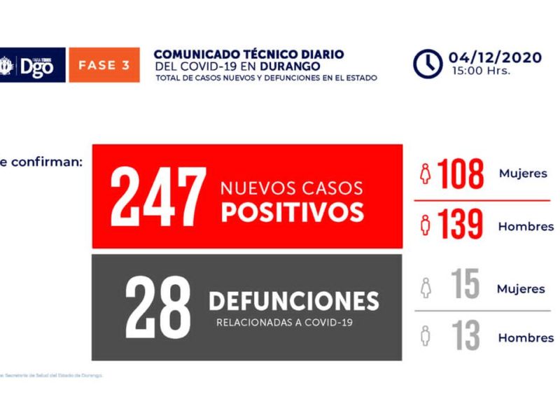 Este viernes se confirmaron 247 nuevos casos confirmados de los que 108 son mujeres y 139 hombres, de los cuales 82 corresponden a Topia, 57 a Gómez Palacio, 48 de Durango, 19 de Cuencamé, 13 de Lerdo y 10 de Pueblo Nuevo.